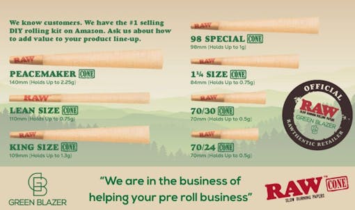 Green Blazer leverages their unique access to consumer data on Amazon’s platform to assist pre-roll businesses in understanding how to utilize RAW’s brand cachet to move pre-roll inventory faster on crowded retail shelves. In this maturing pre-roll environment, commodity cones just don’t cut it anymore.