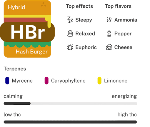 Hash Burger is a highly potent and sought-after strain, with many users praising its strong, relaxing effects and unique flavor profile, which is often described as earthy, cheesy, and similar to a burger. The strain is reported to provide a fast-acting and long-lasting high, with both head and body effects, making it suitable for managing pain, anxiety, and insomnia, as well as for recreational use. Overall, users rave about Hash Burger’s exceptional quality, potency, and flavor, with many considering it one of their favorite strains. – AI summary of Leafly reviews