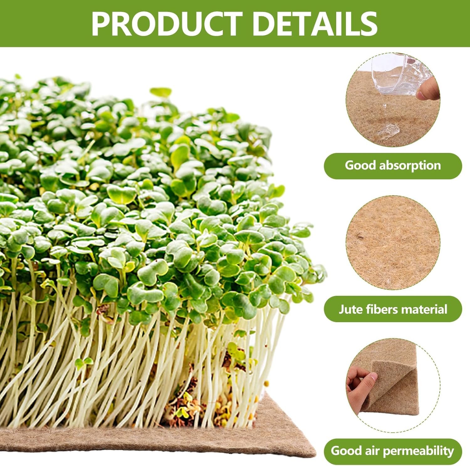 NATURAL MATERIAL: Our jute plant grow mats are Made of biodegradable jute fiber, durable and high water absorption. They help your microgreens seeds evenly absorb water for long time, so don’t need wet the mat on daily basis.