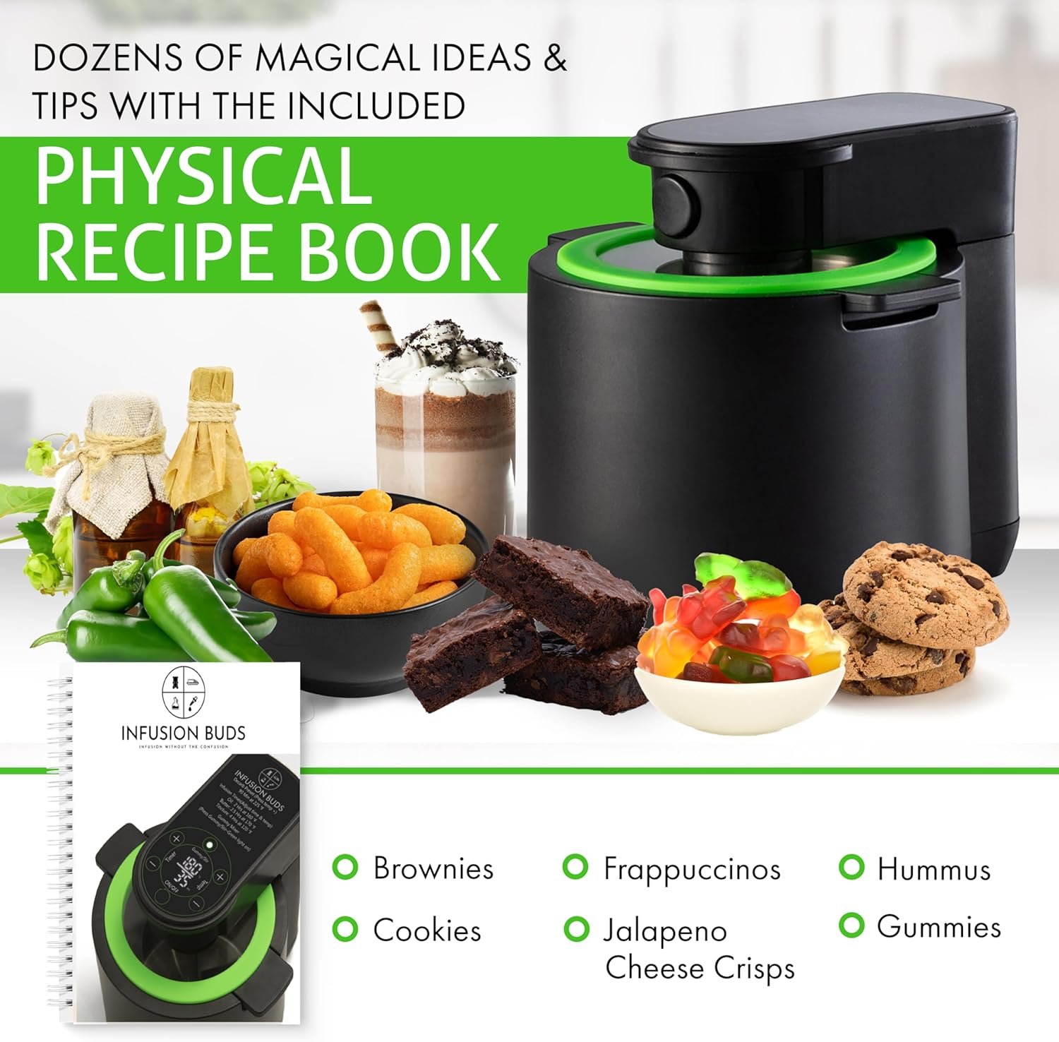 Includes Everything You Need: Infusion Buds 3-IN-1 extractor machine for decarbing, infusing, and mixing gelatin, 3 gummy molds, a butter mold with lid, Infuser & Gummy Mixer attachment, custom strainer & press, and Physical Recipe Book.