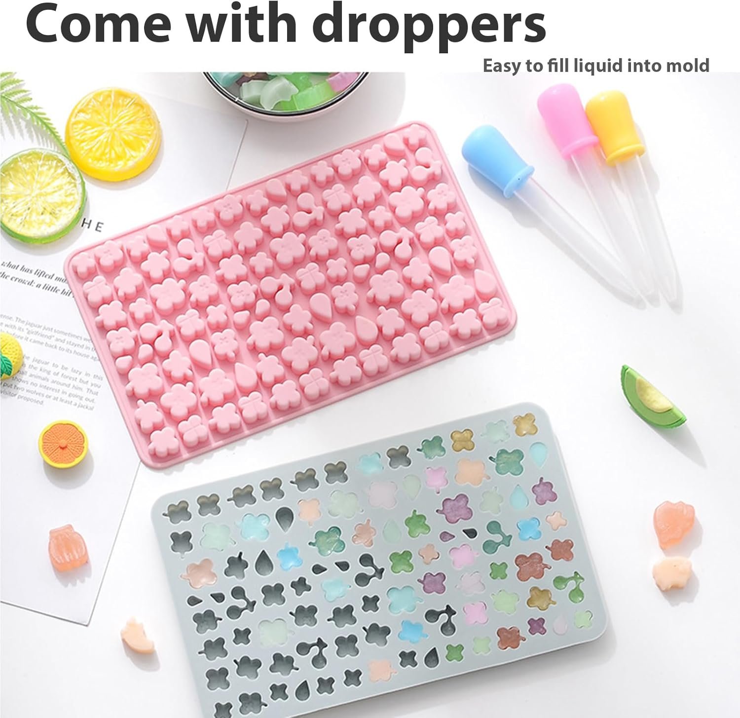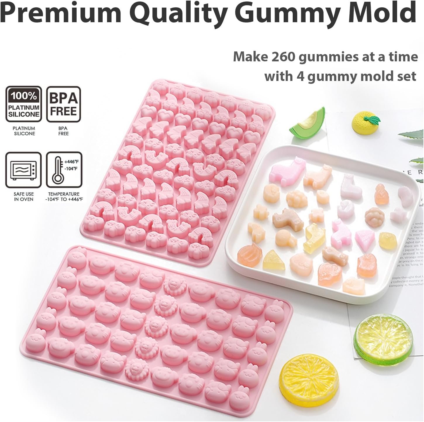 Silicone Nonstick Mold- This 4-pack of gummy candy molds is made of food-grade silicone, flexible, and non-stick. Heat-resistant temperature -104℉ to 446℉ (-40℃ to 230℃). Safe for use in oven, microwave, dishwasher, fridge, freezer.