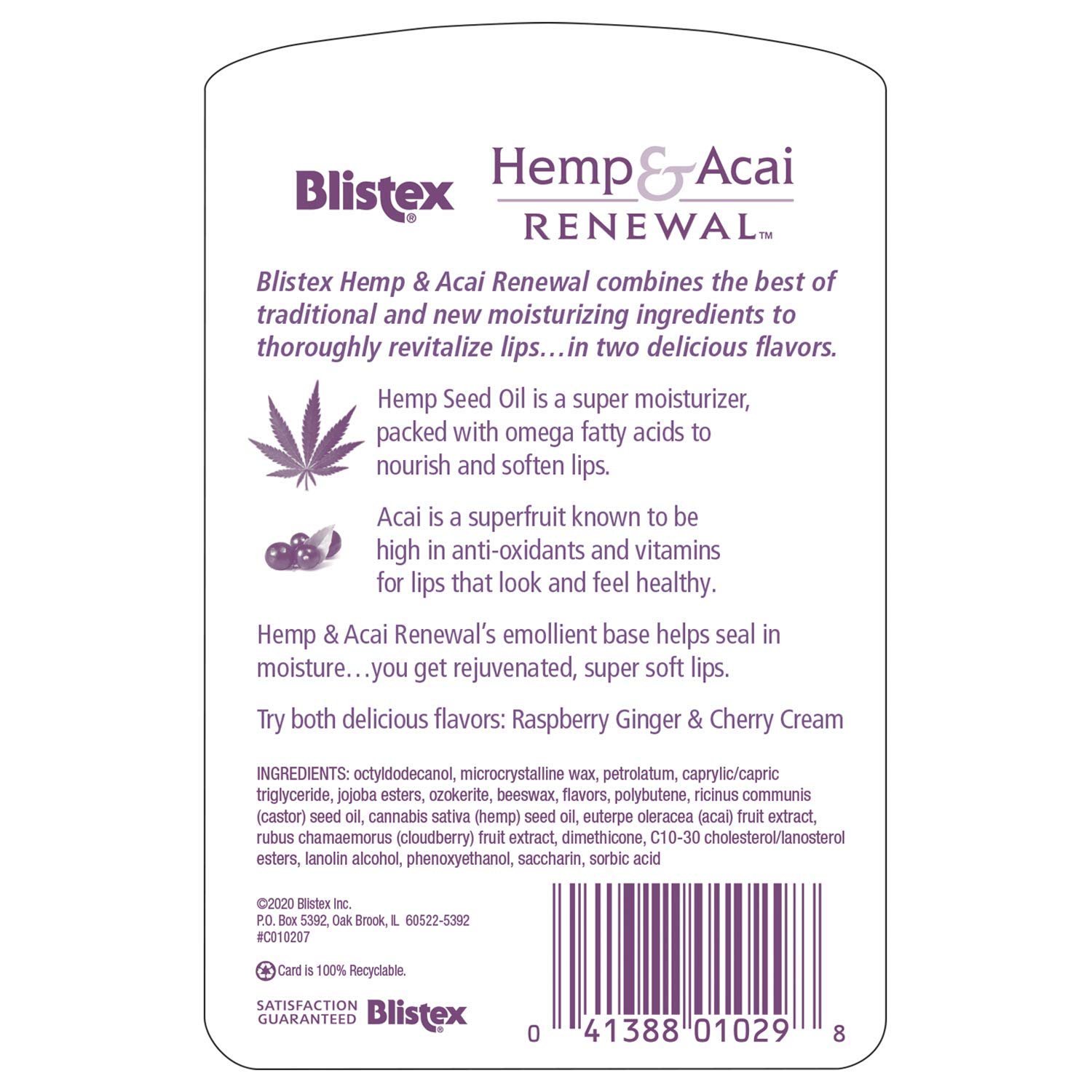Blistex Hemp and Acai Renewal Lip Balm combines the best of traditional and new moisturizing ingredients to thoroughly revitalize lips in two delicious flavors. Hemp Seed Oil is a super moisturizer, packed with omega fatty acids to nourish and soften lips. Acai is a superfruit known to be high in antioxidants and vitamins for lips that look and feel healthy. Hemp and Acai Renewal emollient base helps seal in moisture you get rejuvenated, super soft lips. Try both delicious flavors: Raspberry Ginger & Cherry Cream. Daily lip care can help keep lips their healthiest. And it can help to have a good daily routine all year round.