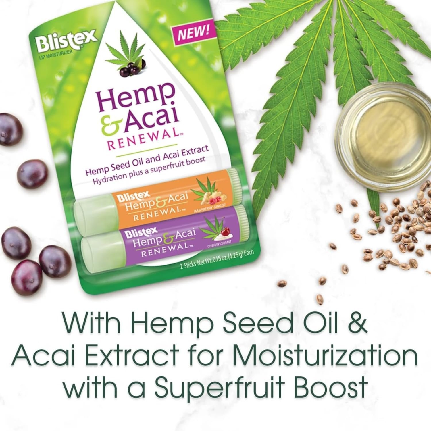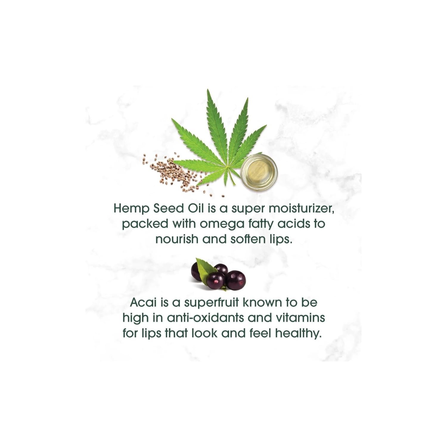 RELIEVE DRY & CHAPPED LIPS: The Hemp Seed Oil and Acai Extract Hydration combines the best of traditional and new moisturizing ingredients for a thoroughly revitalizing lip treatment in two delicious flavors.