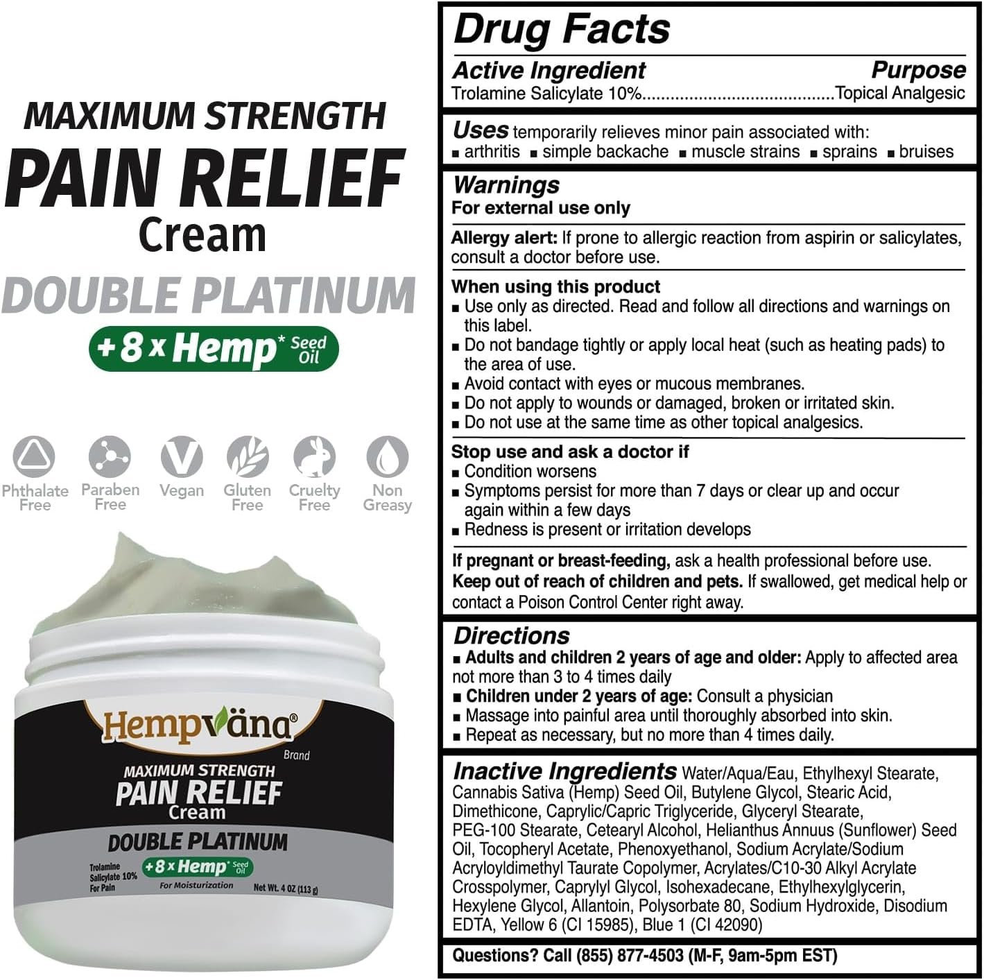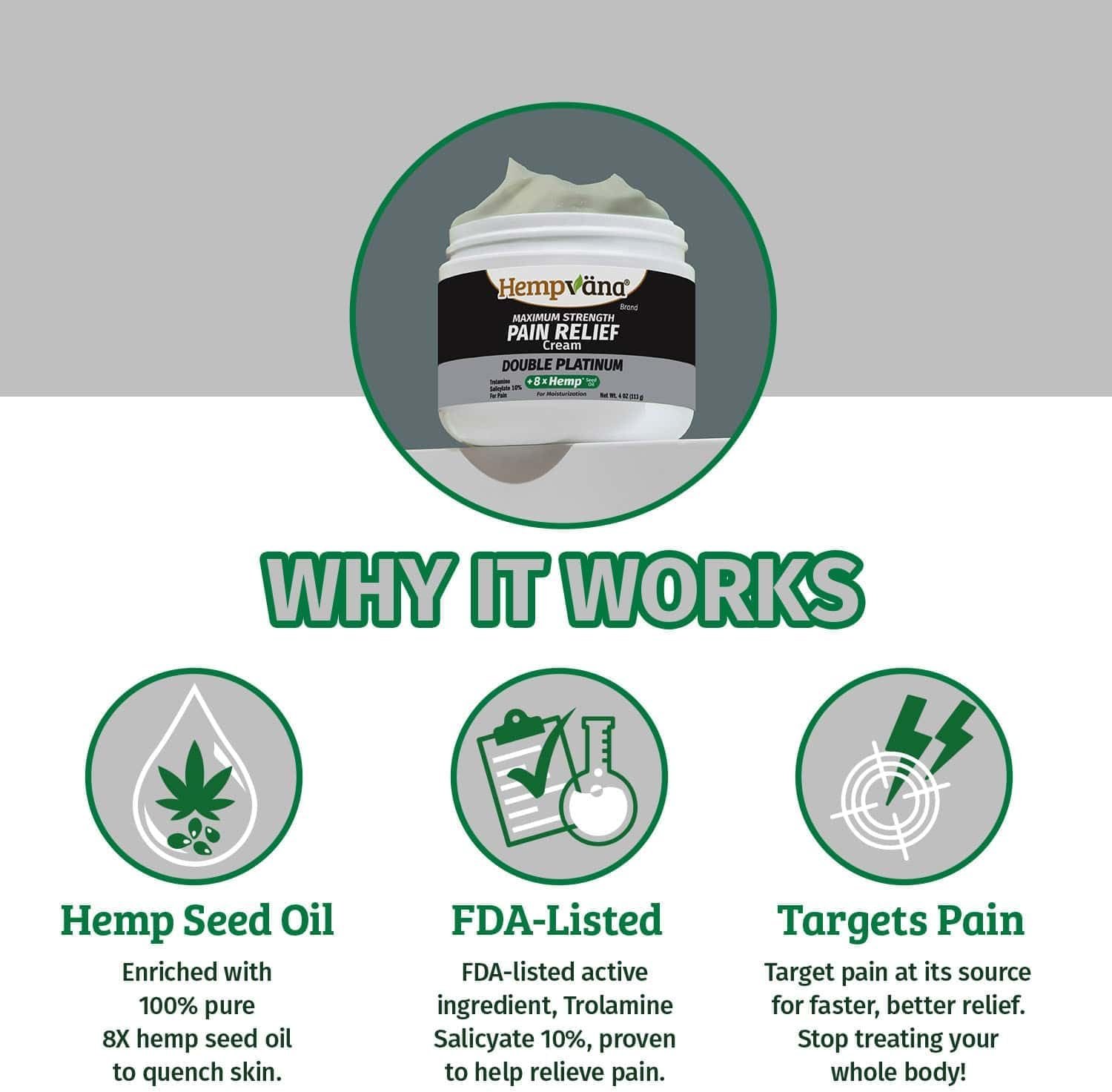 DOUBLE PLATINUM PAIN RELIEF: our Double Platinum formula with 8X hemp provides temporary relief from inflammation, swelling, and stiffness due to arthritis, muscle strains, and backaches