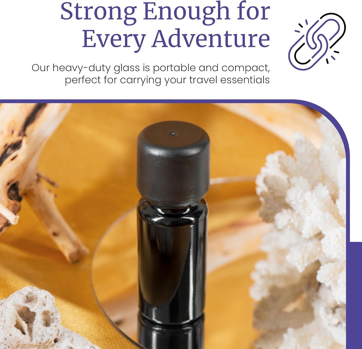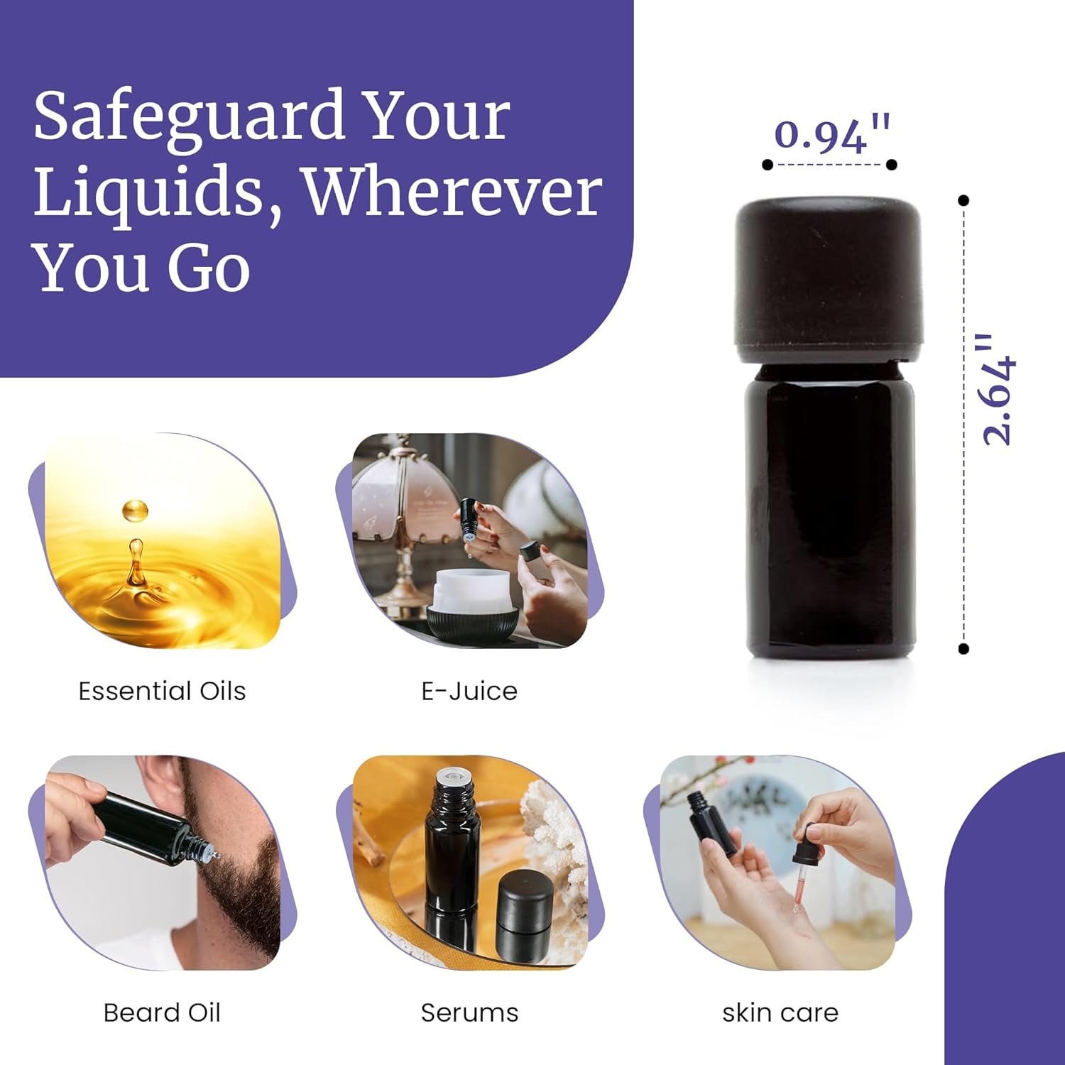 𝗔𝗜𝗥𝗧𝗜𝗚𝗛𝗧 𝗦𝗘𝗔𝗟: It offers extra protection by sealing out air. With a screw-threaded mouth and a tightly fitting black cap, the bottle effectively prevents leaks, keeping your essential oils, perfumes, and liquids fresh—perfect for travel.