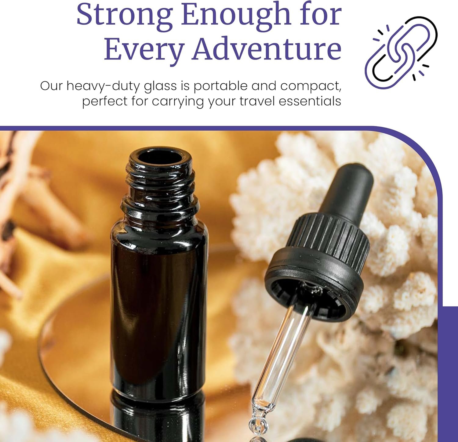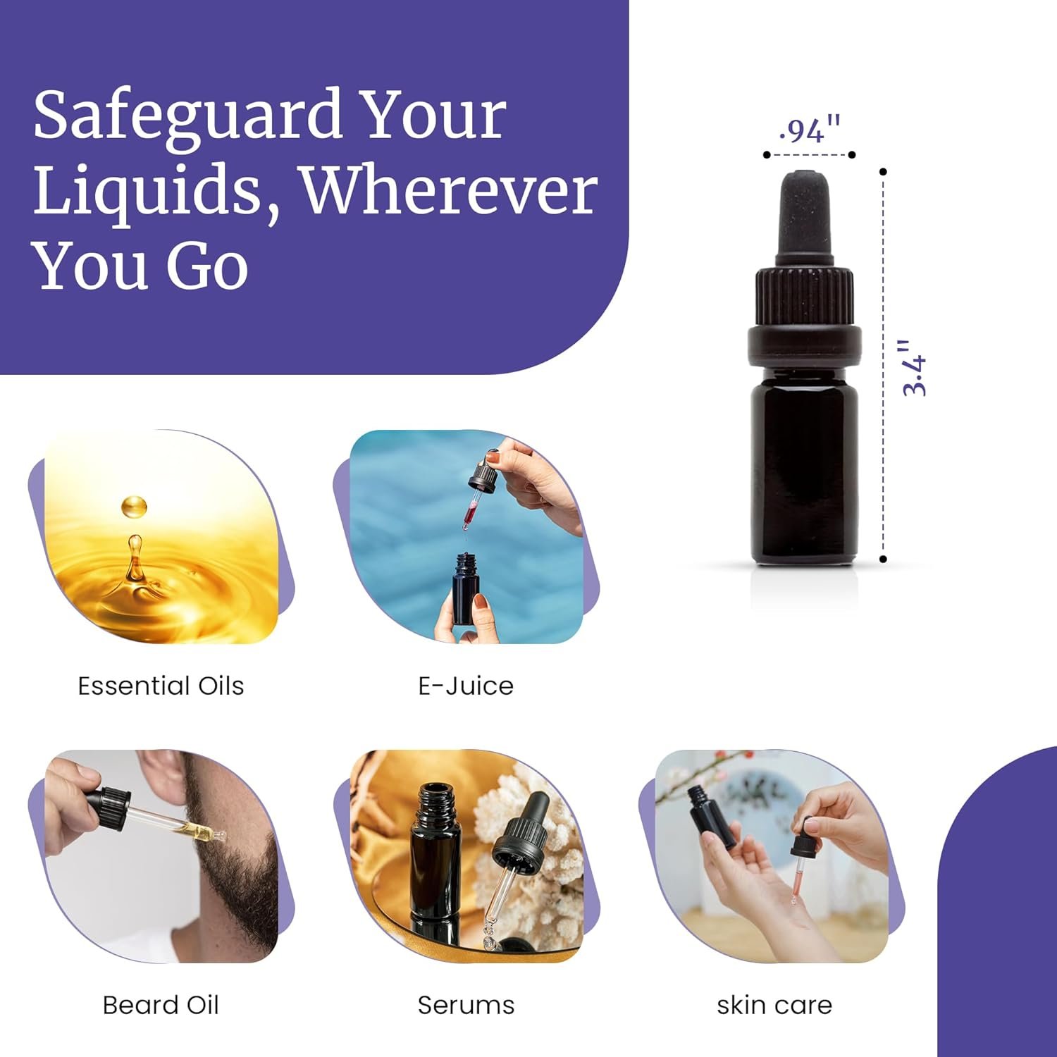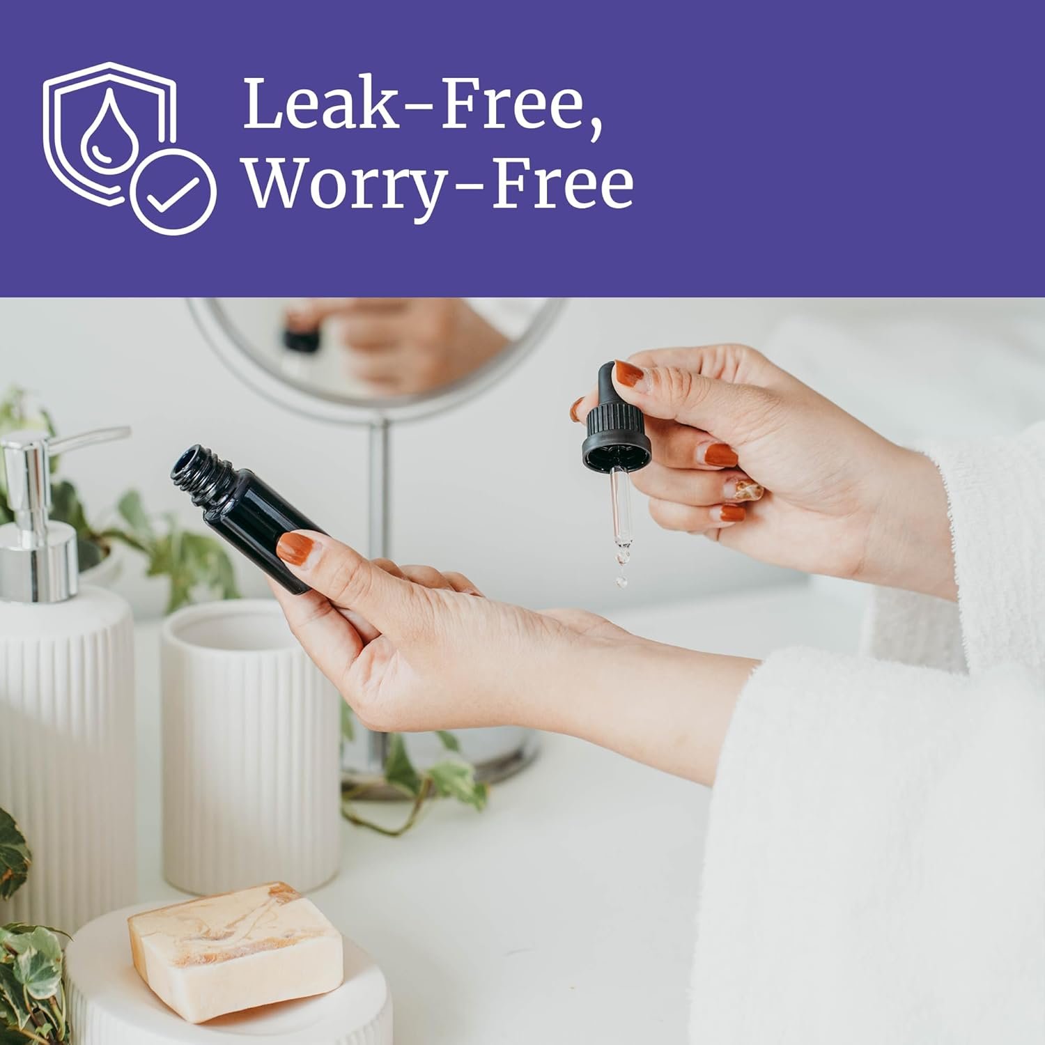 𝗔𝗶𝗿𝘁𝗶𝗴𝗵𝘁 𝗦𝗲𝗮𝗹 & 𝗟𝗲𝗮𝗸-𝗣𝗿𝗼𝗼𝗳 𝗗𝗲𝘀𝗶𝗴𝗻: The reusable glass dropper bottle mouth has a screw thread finish that is paired with a black cap, which fits tightly and can effectively prevent. Leakproof Travel Bottles ensure your essential oils, perfumes, and liquids stay fresh without any messy leaks, making it perfect for travel.