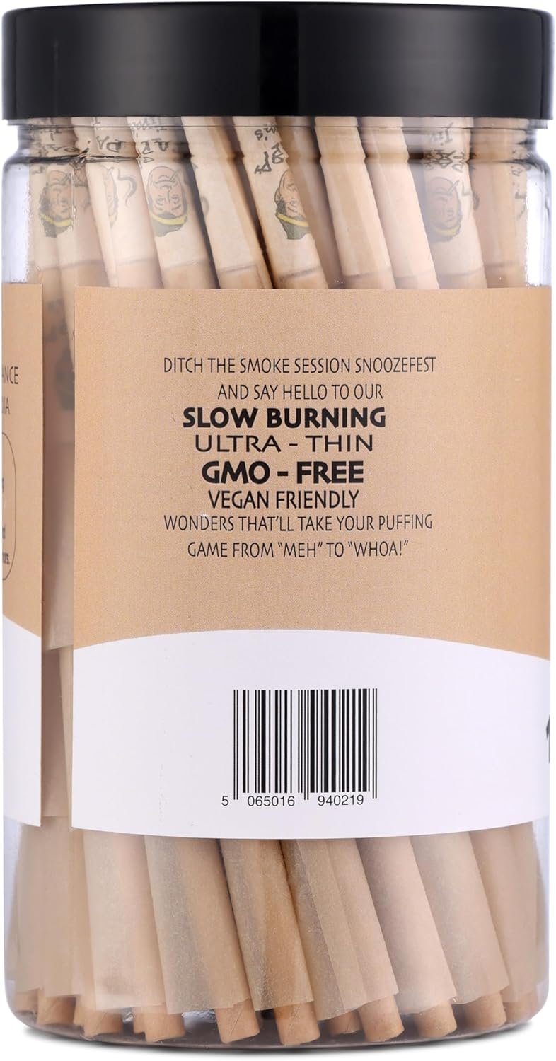 Experience the pure, natural smoking pleasure of Papa Jim’s 84mm Unbleached Pre-Rolled Cones – 150 Count. Made with premium unbleached French paper, these classic-size cones provide a smooth, slow burn that preserves the flavor of your herbs without any additives. Each cone is designed with a built-in W filter tip to ensure clean airflow and reduce waste. The package includes packing sticks so you can fill your cones quickly and neatly every time. Housed in a resealable, crush-proof jar, these cones stay fresh and ready for whenever you want to roll, relax, and enjoy. ✨ Natural paper. Premium quality. Effortless sessions.