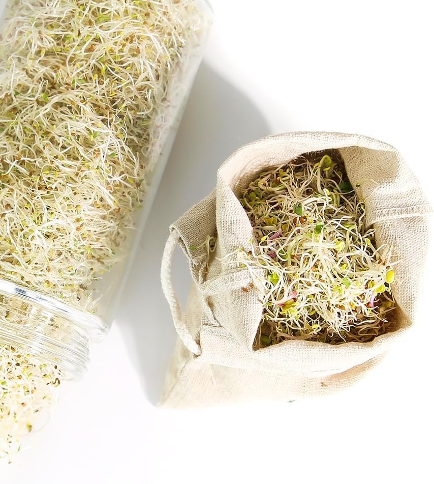 Grow your own food using Sproutman’s Sprout Bag, made from 100% organic hemp. Sprout Bag is designed specifically for growing sprouts. The natural hemp fiber features perfect drainage and ideal aeration. Made from sustainably-produced, untreated, chemical-free industrial hemp fiber. Sprout Bag is easy to use, extremely-durable. The Sprout Bag makes growing your sprouts easy as 1-2-3! Here’s how it works. Just dip ‘n hang! Dip the bag with sprouting seeds in water twice per day. Hang the bag on a hook, or lay it flat to drain! It takes less than a minute. Watch the seeds transform into sprouts. Ready for harvest in 3-5 days