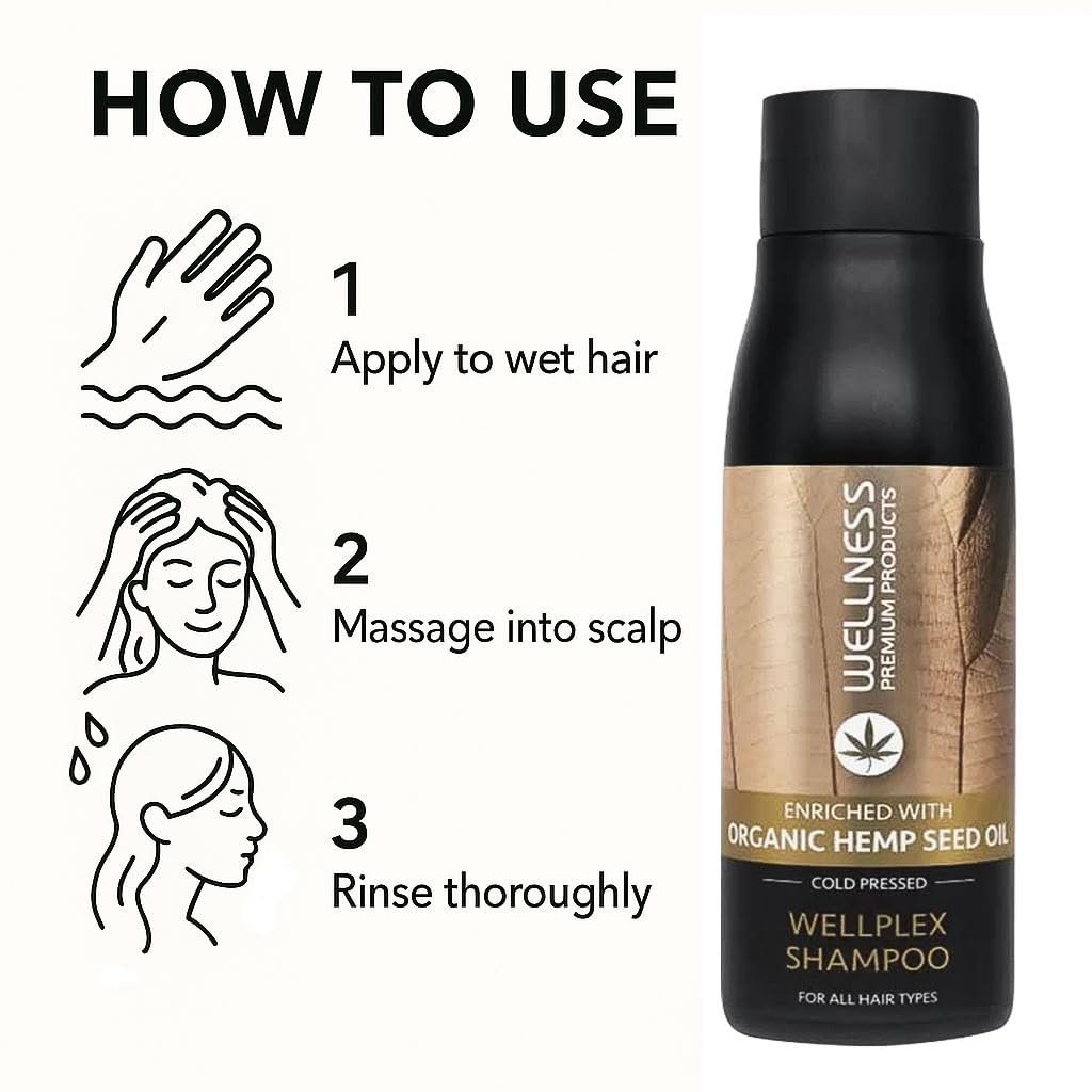 Wash hair with Wellplex conditioner/shampoo, apply Wellplex leave-on hair mask on wet hair for 5 to 60 minutes, apply serum at the end