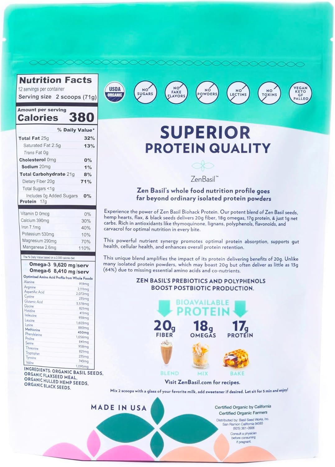 Discover the revolutionary Zen Basil Biohack, a plant-based powerhouse that transforms your nutrition game. This unique blend of organic zen basil seeds, organic flaxseed meal, organic hulled hemp seeds & organic black seeds deliver an impressive nutritional profile. Each serving packs 20g of fiber, 18g of essential omegas, and 17g of complete protein while maintaining just 1g of net carbs. This USDA organic certified whole foods is thoughtfully crafted to cleanse, energize, and help you feel fuller longer. Perfect for those following vegan, paleo, or keto lifestyles, these versatile clean igredients can be added to any food or drink. These Superfoods are free from gluten, toxins, lectin, and glyphosate, making it a clean choice for your daily nutrition needs. Rich in natural compounds including thymoquinone, lignans, polyphenols, flavonoids, and carvacrol, offers comprehensive nutrition for those seeking optimal wellness.
