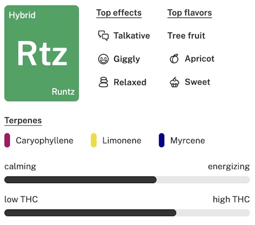 Another Leafly Strain of the Year winner, this time back in 2020, Runtz is an uplifting, social hybrid that’ll keep your wits sharp and your tongue wagging. One of the biggest appeals of the Trailer Park Mall is the chance to chit-chat with the various artists and shop owners, who are often some of the most interesting folks in the city. Runtz will heighten your social prowess, not send you retreating into your own mind.