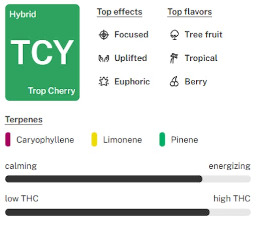 The closest thing the weed world has to a mana potion, Trop Cherry is a focusing hybrid with a sweet flavor and an unrivalled ability to help you lock in. Your mental vision will narrow and focus, so conquering Catan, defeating the dungeon’s boss, or painting your figurines for hours on end become completely engrossing activities. Make sure your Constitution stat is up to snuff before you tango with Trop Cherry, however. It’s a very potent strain meant for high-level consumers.