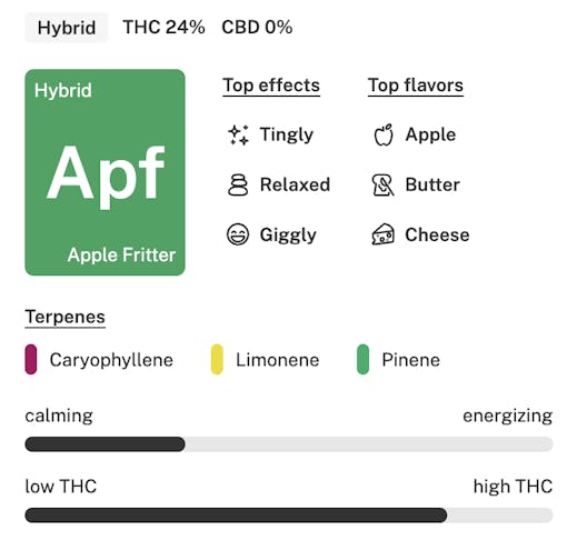 Grind up a bowl of fall flavors with Apple Fritter. A deeply chill heavy hitter, Apple Fritter combines the stoneyness of GSC with the energy of a diesel. It tastes like sweet, earthy apples with buttery pastry notes and hits with tingly waves of relaxation. A true hybrid, Apple Fritter tends to be on the potent side, but leans more giggly, energetic, and stress-melting than sleepy. Smoke a bowl and pop on a campy 80s horror movie for fall-maxxing done right.