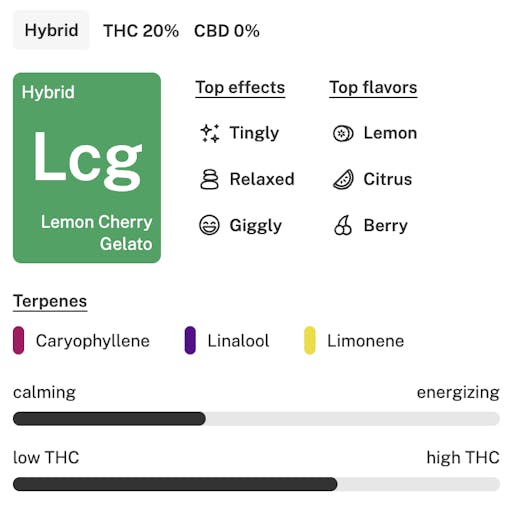 Our pick for a can’t-beat summertime hit, Lemon Cherry Gelato is three different flavors of summer swirled into one delicious combo. It’s the sort of strain that gets better when smoked in the sunshine. You can expect a tingly, relaxed good time from this strain’s respectable 20% THC and carophyllene-forward terpene profile, the ideal partner for any number of summertime activities. Stock up for whatever you’ve got planned for the warmer months at your local dispensary and have a sweet summer.